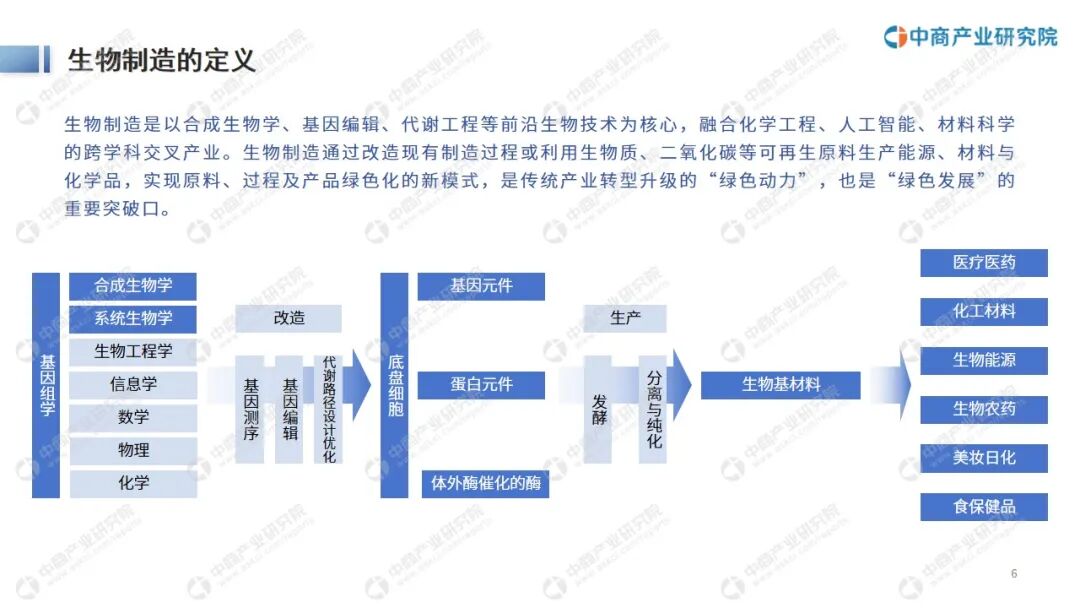 生物制造是以合成生物学、基因编辑、代谢工程等前沿生物技术为核心,融合化学工程、人工智能、材料科学的跨学科交叉产业。生物制造通过改造现有制造过程或利用生物质、二氧化碳等可再生原料生产能源、材料与化学品,实现原料、过程及产品绿色化。