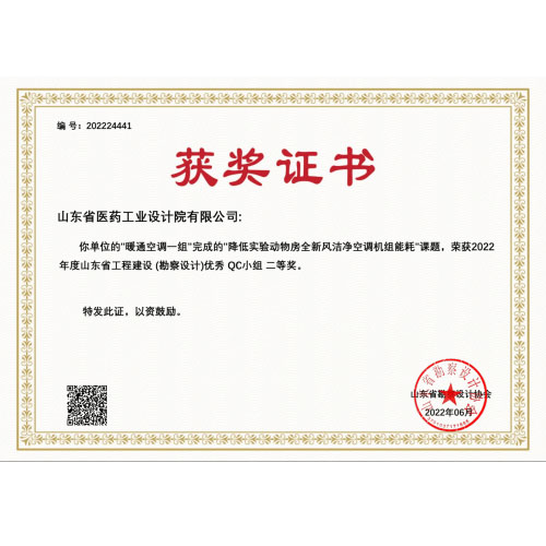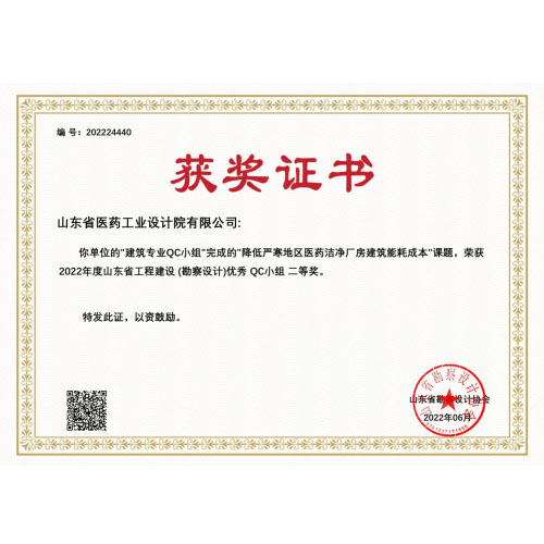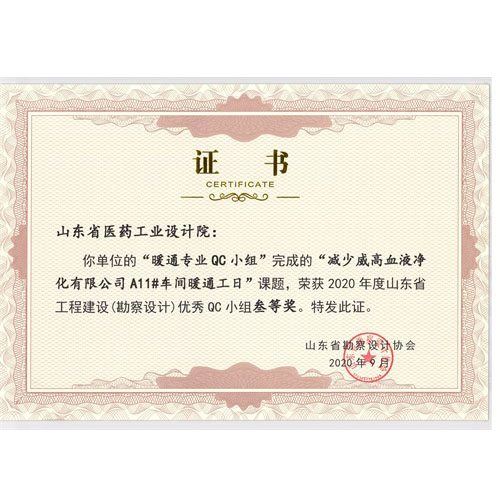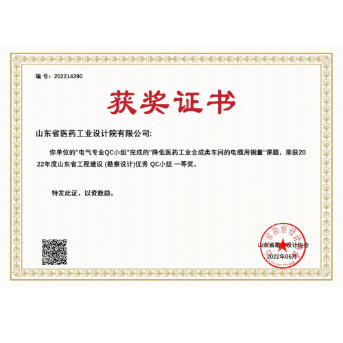 2020年度山东省工程建设(勘察设计)优秀QC小组叁等奖
