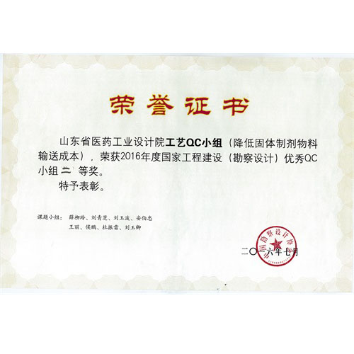 2016年度国家工程建设(勘察设计)优秀QC小组二等奖